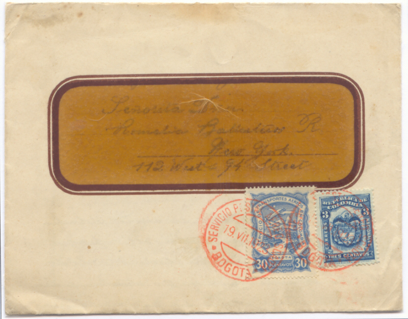 frankiert mit 30 Centavos (SCADTA - Marke) F13 über dem Magdalenenstrom mit Vulkan "El Tolima" und 3 Centavos. Schon 1919 wurde vom Ingenieur W.Kämmerer, die deutsch - kolumbianische Aktiengesellschaft "Sociedad Colombo - Alemana des Transports Aéros" (SCADTA) gegründet. 1920 entschied sich die Gesellschaft für die Junkers F13, die erste F13 die "Columbia" Kennung: A-2 Werknummer: 557 wurde auf der Strecke: Barranquilla - Puerto Berrio eingesetzt (Wasserflugzeug). Die zweite F13 "Bogota" Kennung: A-4 Werknummer: 554 wurde später als Landflugzeug umgerüstet. Die dritte F13 war die "Magdalena" Kennung: A-8 Werknummer: 602. Die Luftverhehrsgesellschaft SCADTA war eine der ersten in der Welt, die mit der Junkers F13 flog und besaß 17 Flugzeuge dieses Typs. |