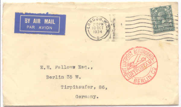 Luftpostamt Berlin C2, der rote Stempel bestätigte die Beförderung mit