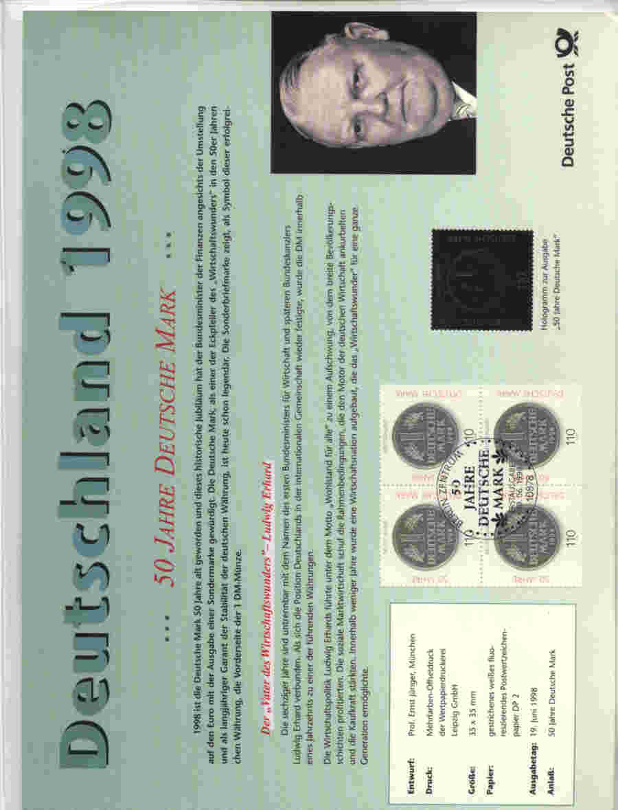 2D abgebildet sind: Inschrift 50 JAHRE, DEUTSCHLAND, DEUTSCHE MARK, Wert 110, Jahreszahl 1998 und eine Deutsche Mark. |
