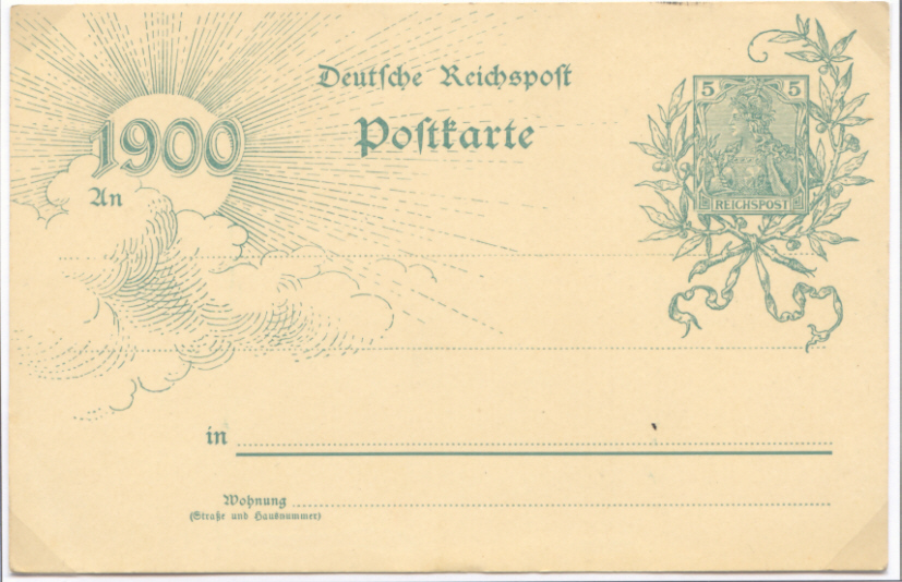 Sonderpostkarte zur Jahrhundertwende, Germania - "REICHSPOST". Vordruck mit Verzierung: Lorbeerzweige um den Wertstempel, links: Jahreszahl "1900" in der Sonne, aus den Wolken heraustretend. |