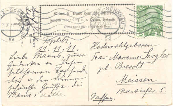 Stifter Karte Nr. 16 von Ernst Kutzer, gestempelt am 11.11.1911 von Teplitz - Schönau nach Meissen.