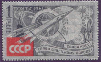 vor Erdkugel, Kremlturm und Sternen; Inschrift "Ruhm der KPdSU ! Ruhm dem Sowjetvolk" |