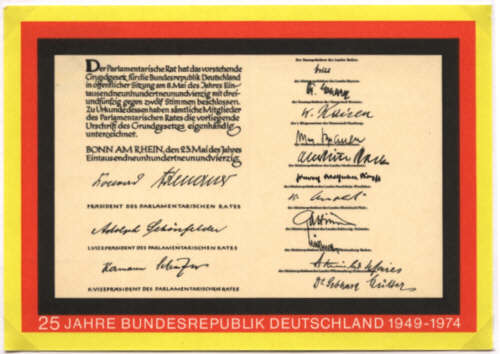 mit den Unterschriften von: Konrad Adenauer, Adolph Schönfelder, Hermann Schäfer und die 11 damaligen Ministerpräsidenten der Bundesländer. |