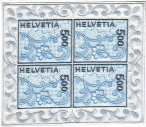 Erste Stickereimarke der Welt. Das in zwei Blautönen gestickte, filigrane Polyestergewebe repräsentiert die weltbekannte Kunst der St. Galler Stickerei. Die Marke wurde auf einer Stickmaschine, Typ Saurer–Pentamat 2040 hergestellt. |