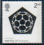 ![]() Der mit thermochromatischer Tinte ausgeführte Druck verändert seine Farbe bei Erwärmung ab einer bestimmten Temperatur. Nach Abkühlung kehrt die ursprüngliche Farbe zurück. Die anlässlich des Chemie-Nobelpreises herausgegebene Marke zeigt ein Kohlenstoff-60-Molekül. |