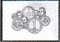 Die zwölf Sterne wurden in Goldfolien-Heißprägung aufgebracht. Die Euro-Länder ("Euroland") sind mit Kippfarben (glänzend und matt) gedruckt, die 1-Euro-Münze in Gold- und Silberfarben ist ausserdem mit einer Blindprägung versehen. Das geschwungene Kreuzraster rechts im Bild deutet eine Guilloche (verschlungene regelmäßige Linien, wie zB. auch auf Banknoten und Wertpapieren zu sehen) an. Die Vorderseite wurde mit dem Computer konstruiert, die Vorlage für den (übrigens nicht gesundheitsschädlichen) Buchdruck auf dem Gummi der Rückseite ist eine Handzeichnung: Schillingmünzen aus verschiedenen Perioden und vertraute Köpfe, die auf Österreichischen Banknoten dargestellt sind. |