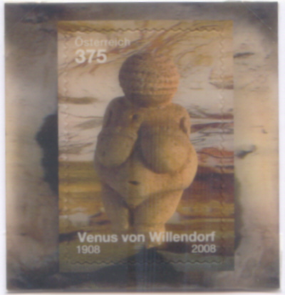 sie in Willendorf (Wachau) gefunden. Die Figur ist 11 cm hoch und besteht aus feinem Kalkstein. Sie ist im Naturhistorischen Museum in Wien zu sehen. Ein dreidimensionaler Effekt lässt die "Venus" in platischer Form erscheinen. |
