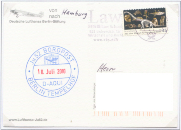 Bordpoststempel: D-AQUI "Berlin Tempelhof" mitgeflogen am 18.07.2010