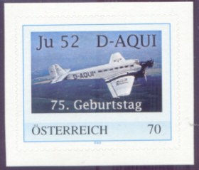 Junkers JU 52 /3m D-AQUI "Berlin Tempelhof" zum 75. Geburtstag. Im Schriftzug: ÖSTERREICH ist unter der Fluoreszenslampe ein Posthorn und Post. at sichtbar. |