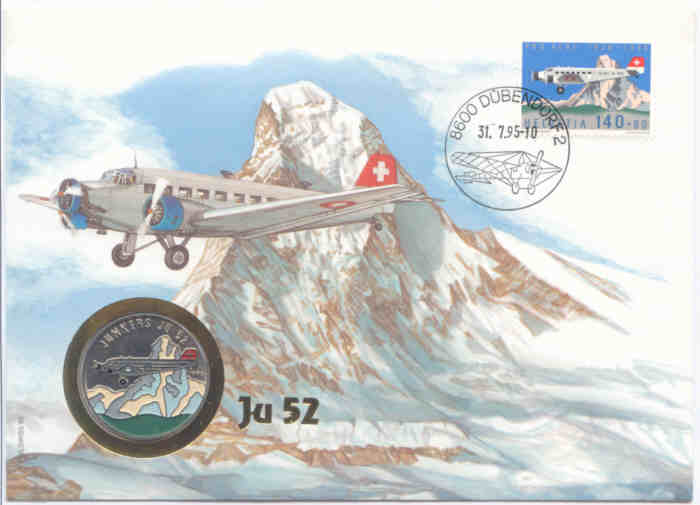 Sonderstempel Dübendorf 31.07.1995, mit 50 Jahre Stiftung Pro Aero und Farbmünze 100 Francs REPUBLIQUE DU CONGO.