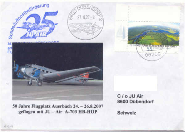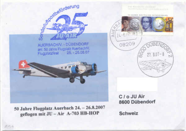 Luftpostbeförderung der JU - Air, Schweiz. Anläßlich vom Flugplatzfest "50 Jahre Flugplatz Auerbach im Vogtland" 24. - 26.08.2007. Geflogen mit JU - Air A-703 HB-HOP von Auerbach nach Dübendorf (bei Zürich) |