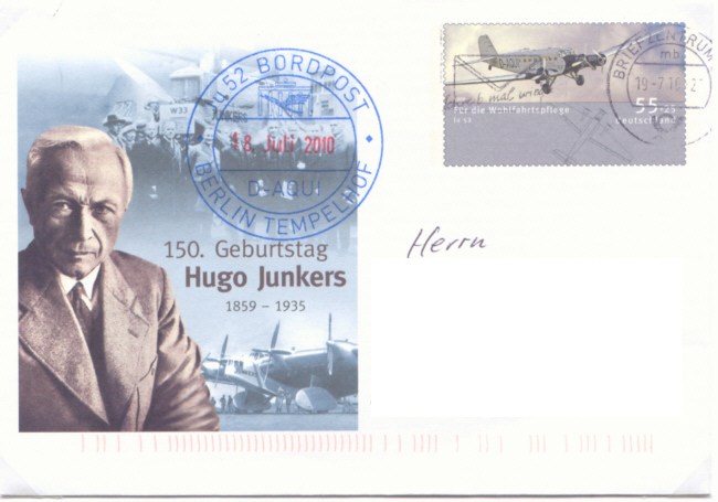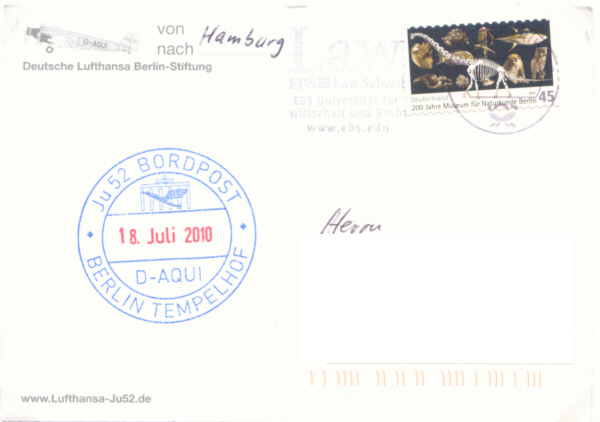 Bordpoststempel: D-AQUI "Berlin Tempelhof" mitgeflogen am 18.07.2010