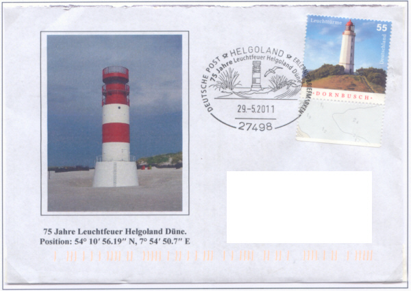 Deutsche Post HELGOLAND Erlebnis Briefmarken 75 Jahre Leuchtfeuer Helgoland Düne 29.5.2011 frankiert mit Michel Nr. 2743 Leuchtturm "DORNBUSCH". Im Stempel: Leuchtfeuer "HELGOLAND DÜNE" mit Strandhafer und Möwe. |