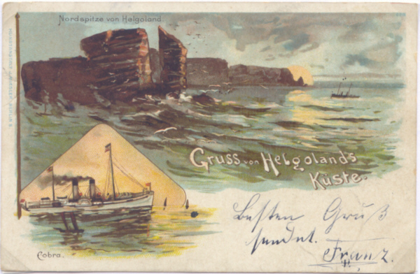 Bildpostkarte der Insel Helgoland mit Raddampfer „COBRA“, frankiert mit Michel Nr.53, gestempelt am 20.7.1901 in Hamburg Der Raddampfer „COBRA“ fuhr für die „Hamburg – Amerika – Linie“ bis 1921 im Seebäderdienst, die Route verlief von Hamburg über Cuxhaven nach Helgoland.