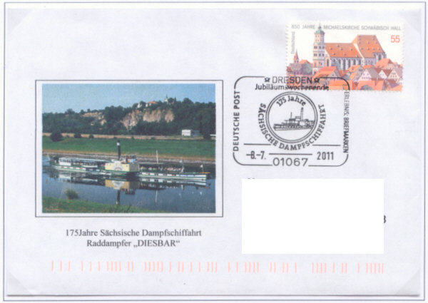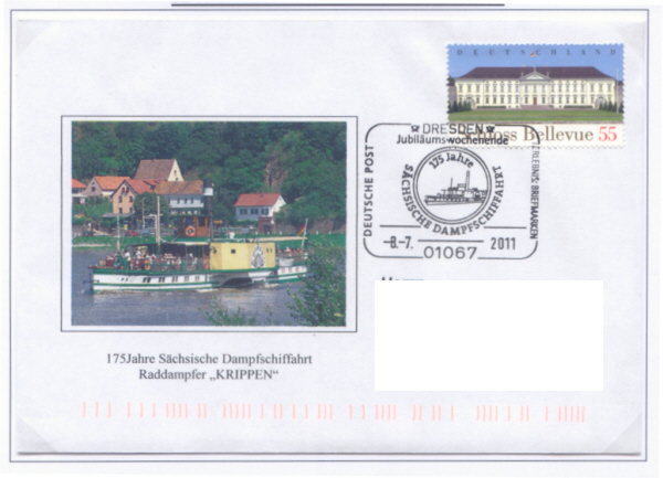 Sonderstempel 8.7.2011: DRESDEN Jubiläumswochenende 175 Jahre SÄCHSISCHE DAMPFSCHIFFAHRT,