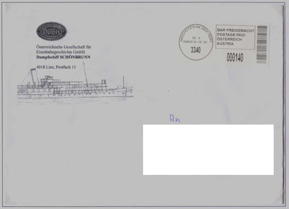 Briefumschlag mit Werbung für den Raddampfer "SCHÖNBRUNN".