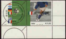 Zusammendruck. Es handelt sich um eine Gemeinschaftsausgabe der Länder Argentinien, Brasilien, Deutschland,Frankreich, Italien und Uruguay. Alle ehemaligen Fußballweltmeister–Nationen - mit Ausnahme von England -, beteiligen sich an der Ausgabe. Die Wuppertaler Grafikerin Andrea Acker gestaltete die nahezu in allen Ländern motivgleich erscheinende Marke. Diese zeigt ein stilisiertes Fußballfeld und die Flaggen der Weltmeister – Nationen. Für Argentinien, Brasilien, Uruguay und Deutschland entwarf sie auch die zweite Marke. Sie zeigt eine Spielzene mit dem jeweiligen National – Trikot des Landes. Der zweite Entwurf der Ausgaben von Frankreich und Italien stammt jeweils aus der Feder eines nationalen Künstlers |